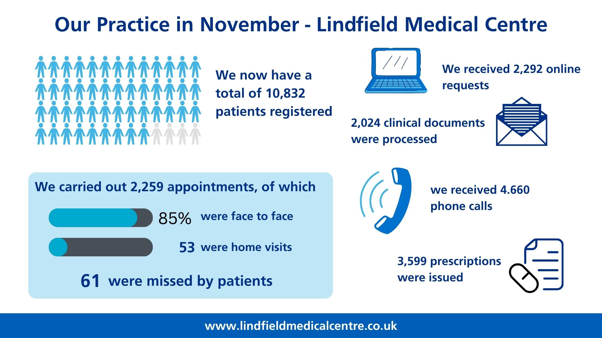 In November we supported thousands of patients across appointments, calls, prescriptions and online requests, and our team worked hard behind the scenes to keep everything running smoothly. Thank you to all our patients for working with us and helping us provide the best possible care.